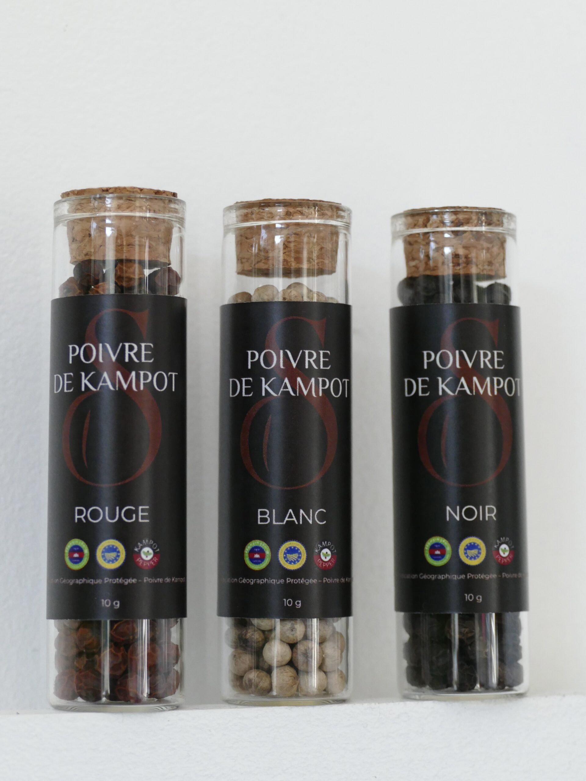Issu des baies rouges du poivre noir, le poivre blanc de Kampot est obtenu après un processus traditionnel de trempage puis d’écorçage, réalisé à la main. Cette étape révèle le cœur du grain : une épice d’une grande élégance, plus douce et subtile, mais incroyablement aromatique. Labellisé IGP, il est cultivé de façon artisanale dans les fermes familiales de Kampot, où le terroir riche et l’expertise locale lui donnent une qualité exceptionnelle.